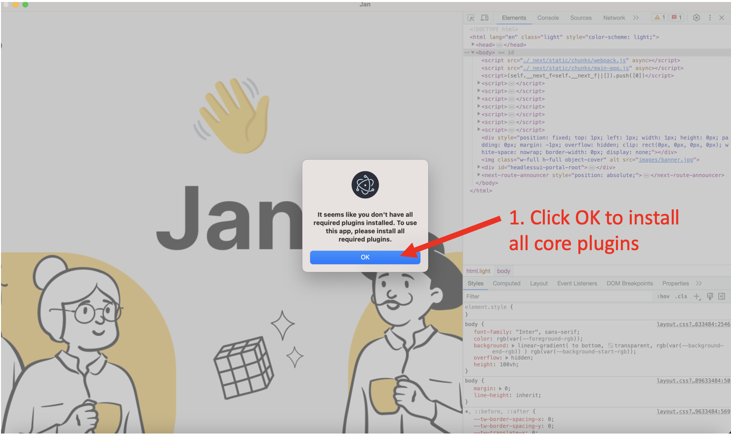* hackathon: Refactor Jan into an Electron app * chore: correct NextJS export output path * chore: build electron app for all production targets * fix: correct assetPrefix for production build * chore: preferences shortcut * chore: refactor * chore: refactor into ts * feature/#52-compile-plugin-with-webpack * chore: introduce renderer <=> plugins <=> main invocation * chore: suppress errors - deprecate graphql & next-auth * chore: data plugin functions * add llm support Signed-off-by: James <james@jan.ai> * chore: update plugin * chore: introduce data-plugin * chore: plugin invokes main with args and synchronously * chore: install db plugin should setup db * feature: Data Driver Plugin - Load conversations and messages from data plugin * chore: store text message sent * chore: shared core services * feature: inference service * chore: conversations ordering * adding model management service Signed-off-by: James <james@jan.ai> * chore: strict type * feature: abstract plugin preferences * chore: abstract plugin preference * Revert "chore: strict type" This reverts commit 9be188d827a0b2e081e9e04b192c323799de5bb5. * chore: base-plugin styling * feature: create and delete conversation * chore: fix plugin search & clean messages * chore: typing indicator * chore: refactor useSendChatMessage * chore: persists inserted id to in-memory messages * chore: search conversation history * add delete and download model (#189) Signed-off-by: James <james@jan.ai> Co-authored-by: James <james@jan.ai> * chore: add empty state for conversation list * chore: prompt missing extension function & fix app crashes * chore: prompt user to install required plugins * chore: add launch background * chore: relaunch app on model downloaded * Jan app add installation instruction (#191) Co-authored-by: Hien To <> * Chore: rename folder web-client to app (#192) * Chore: rename folder web-client to app --------- Co-authored-by: Hien To <> * revert: add pre-install package * add progress for downloading model Signed-off-by: James <james@jan.ai> * feature: production bundle * add download progress Signed-off-by: James <james@jan.ai> * chore: add new chat function * fix: electron asar unpack modules & dynamic import * chore: fix unpack * chore: fix dev pack * Add instruction to build dmg file to README.md * init model dynamically Signed-off-by: James <james@jan.ai> --------- Signed-off-by: James <james@jan.ai> Co-authored-by: James <james@jan.ai> Co-authored-by: NamH <NamNh0122@gmail.com> Co-authored-by: hiento09 <136591877+hiento09@users.noreply.github.com> Co-authored-by: Hien To <>