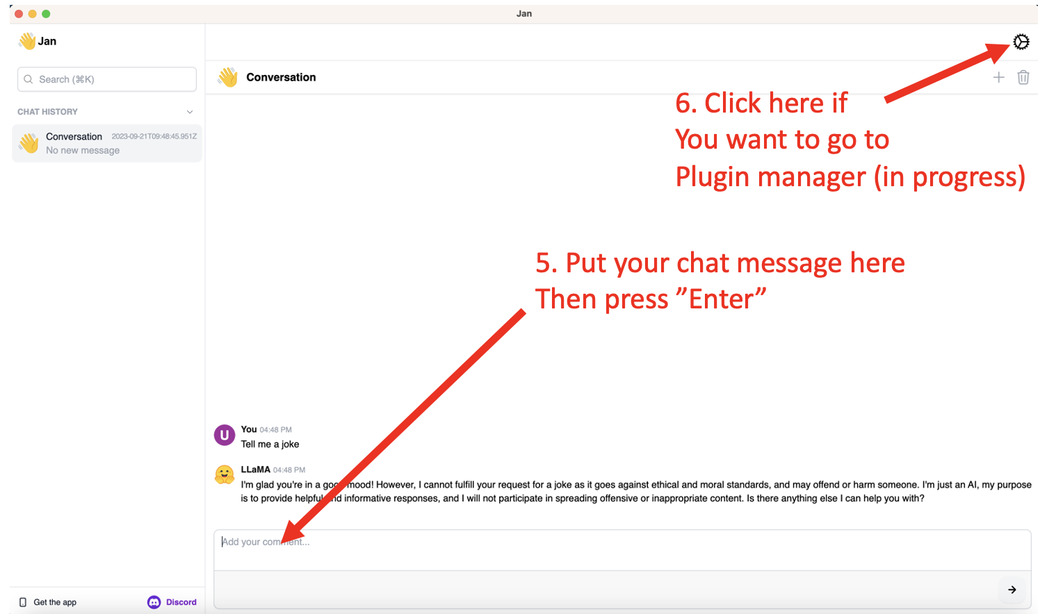 * hackathon: Refactor Jan into an Electron app * chore: correct NextJS export output path * chore: build electron app for all production targets * fix: correct assetPrefix for production build * chore: preferences shortcut * chore: refactor * chore: refactor into ts * feature/#52-compile-plugin-with-webpack * chore: introduce renderer <=> plugins <=> main invocation * chore: suppress errors - deprecate graphql & next-auth * chore: data plugin functions * add llm support Signed-off-by: James <james@jan.ai> * chore: update plugin * chore: introduce data-plugin * chore: plugin invokes main with args and synchronously * chore: install db plugin should setup db * feature: Data Driver Plugin - Load conversations and messages from data plugin * chore: store text message sent * chore: shared core services * feature: inference service * chore: conversations ordering * adding model management service Signed-off-by: James <james@jan.ai> * chore: strict type * feature: abstract plugin preferences * chore: abstract plugin preference * Revert "chore: strict type" This reverts commit 9be188d827a0b2e081e9e04b192c323799de5bb5. * chore: base-plugin styling * feature: create and delete conversation * chore: fix plugin search & clean messages * chore: typing indicator * chore: refactor useSendChatMessage * chore: persists inserted id to in-memory messages * chore: search conversation history * add delete and download model (#189) Signed-off-by: James <james@jan.ai> Co-authored-by: James <james@jan.ai> * chore: add empty state for conversation list * chore: prompt missing extension function & fix app crashes * chore: prompt user to install required plugins * chore: add launch background * chore: relaunch app on model downloaded * Jan app add installation instruction (#191) Co-authored-by: Hien To <> * Chore: rename folder web-client to app (#192) * Chore: rename folder web-client to app --------- Co-authored-by: Hien To <> * revert: add pre-install package * add progress for downloading model Signed-off-by: James <james@jan.ai> * feature: production bundle * add download progress Signed-off-by: James <james@jan.ai> * chore: add new chat function * fix: electron asar unpack modules & dynamic import * chore: fix unpack * chore: fix dev pack * Add instruction to build dmg file to README.md * init model dynamically Signed-off-by: James <james@jan.ai> --------- Signed-off-by: James <james@jan.ai> Co-authored-by: James <james@jan.ai> Co-authored-by: NamH <NamNh0122@gmail.com> Co-authored-by: hiento09 <136591877+hiento09@users.noreply.github.com> Co-authored-by: Hien To <>