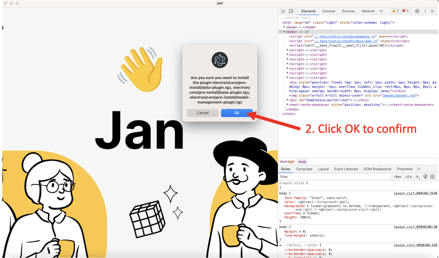 * hackathon: Refactor Jan into an Electron app * chore: correct NextJS export output path * chore: build electron app for all production targets * fix: correct assetPrefix for production build * chore: preferences shortcut * chore: refactor * chore: refactor into ts * feature/#52-compile-plugin-with-webpack * chore: introduce renderer <=> plugins <=> main invocation * chore: suppress errors - deprecate graphql & next-auth * chore: data plugin functions * add llm support Signed-off-by: James <james@jan.ai> * chore: update plugin * chore: introduce data-plugin * chore: plugin invokes main with args and synchronously * chore: install db plugin should setup db * feature: Data Driver Plugin - Load conversations and messages from data plugin * chore: store text message sent * chore: shared core services * feature: inference service * chore: conversations ordering * adding model management service Signed-off-by: James <james@jan.ai> * chore: strict type * feature: abstract plugin preferences * chore: abstract plugin preference * Revert "chore: strict type" This reverts commit 9be188d827a0b2e081e9e04b192c323799de5bb5. * chore: base-plugin styling * feature: create and delete conversation * chore: fix plugin search & clean messages * chore: typing indicator * chore: refactor useSendChatMessage * chore: persists inserted id to in-memory messages * chore: search conversation history * add delete and download model (#189) Signed-off-by: James <james@jan.ai> Co-authored-by: James <james@jan.ai> * chore: add empty state for conversation list * chore: prompt missing extension function & fix app crashes * chore: prompt user to install required plugins * chore: add launch background * chore: relaunch app on model downloaded * Jan app add installation instruction (#191) Co-authored-by: Hien To <> * Chore: rename folder web-client to app (#192) * Chore: rename folder web-client to app --------- Co-authored-by: Hien To <> * revert: add pre-install package * add progress for downloading model Signed-off-by: James <james@jan.ai> * feature: production bundle * add download progress Signed-off-by: James <james@jan.ai> * chore: add new chat function * fix: electron asar unpack modules & dynamic import * chore: fix unpack * chore: fix dev pack * Add instruction to build dmg file to README.md * init model dynamically Signed-off-by: James <james@jan.ai> --------- Signed-off-by: James <james@jan.ai> Co-authored-by: James <james@jan.ai> Co-authored-by: NamH <NamNh0122@gmail.com> Co-authored-by: hiento09 <136591877+hiento09@users.noreply.github.com> Co-authored-by: Hien To <>