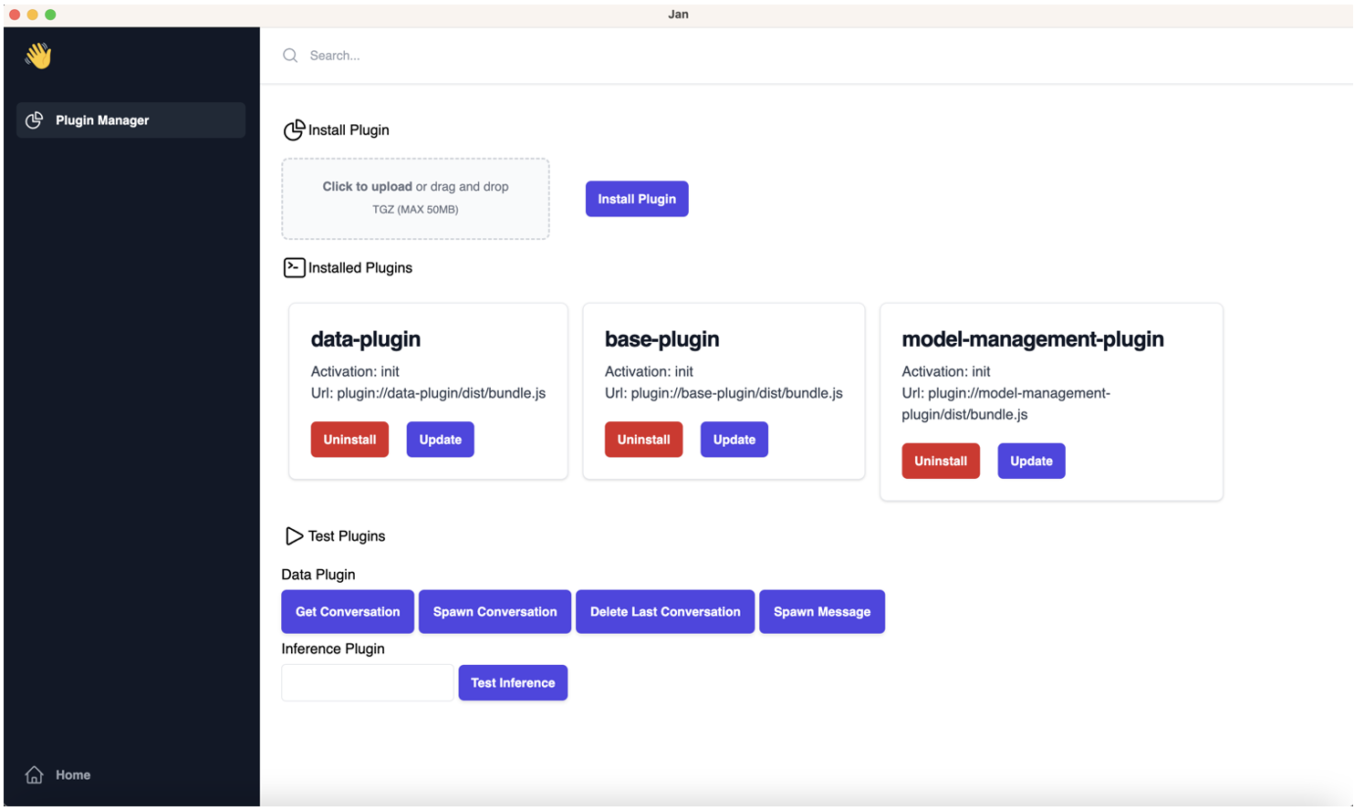 * hackathon: Refactor Jan into an Electron app * chore: correct NextJS export output path * chore: build electron app for all production targets * fix: correct assetPrefix for production build * chore: preferences shortcut * chore: refactor * chore: refactor into ts * feature/#52-compile-plugin-with-webpack * chore: introduce renderer <=> plugins <=> main invocation * chore: suppress errors - deprecate graphql & next-auth * chore: data plugin functions * add llm support Signed-off-by: James <james@jan.ai> * chore: update plugin * chore: introduce data-plugin * chore: plugin invokes main with args and synchronously * chore: install db plugin should setup db * feature: Data Driver Plugin - Load conversations and messages from data plugin * chore: store text message sent * chore: shared core services * feature: inference service * chore: conversations ordering * adding model management service Signed-off-by: James <james@jan.ai> * chore: strict type * feature: abstract plugin preferences * chore: abstract plugin preference * Revert "chore: strict type" This reverts commit 9be188d827a0b2e081e9e04b192c323799de5bb5. * chore: base-plugin styling * feature: create and delete conversation * chore: fix plugin search & clean messages * chore: typing indicator * chore: refactor useSendChatMessage * chore: persists inserted id to in-memory messages * chore: search conversation history * add delete and download model (#189) Signed-off-by: James <james@jan.ai> Co-authored-by: James <james@jan.ai> * chore: add empty state for conversation list * chore: prompt missing extension function & fix app crashes * chore: prompt user to install required plugins * chore: add launch background * chore: relaunch app on model downloaded * Jan app add installation instruction (#191) Co-authored-by: Hien To <> * Chore: rename folder web-client to app (#192) * Chore: rename folder web-client to app --------- Co-authored-by: Hien To <> * revert: add pre-install package * add progress for downloading model Signed-off-by: James <james@jan.ai> * feature: production bundle * add download progress Signed-off-by: James <james@jan.ai> * chore: add new chat function * fix: electron asar unpack modules & dynamic import * chore: fix unpack * chore: fix dev pack * Add instruction to build dmg file to README.md * init model dynamically Signed-off-by: James <james@jan.ai> --------- Signed-off-by: James <james@jan.ai> Co-authored-by: James <james@jan.ai> Co-authored-by: NamH <NamNh0122@gmail.com> Co-authored-by: hiento09 <136591877+hiento09@users.noreply.github.com> Co-authored-by: Hien To <>